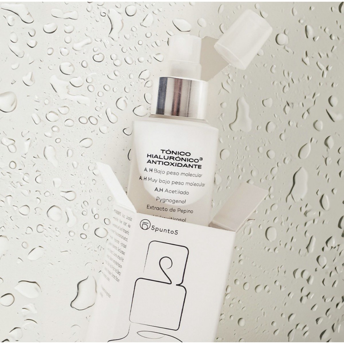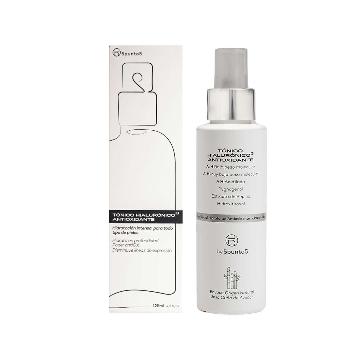 El Tónico Hialurónico 3 Antioxidante de 5punto5 es un tónico de uso diario con 3 tipos de Ácido Hialurónico y antioxidantes que ayudan a repulpar la piel eficazmente, disminuyendo arrugas y líneas de expresión, además de reparar y fortalecer la barrera cutánea de la piel.