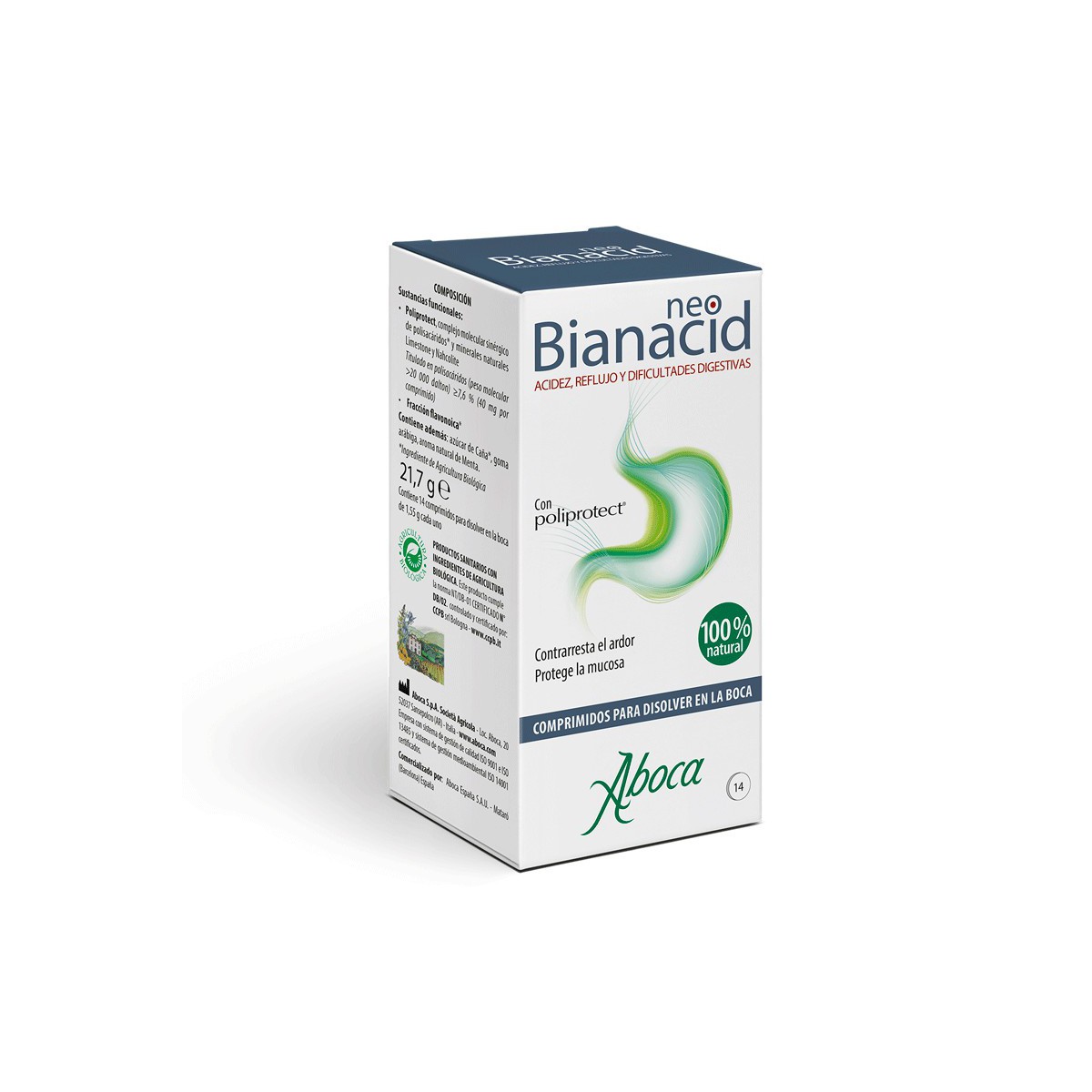 NEO BIANACID es un producto sanitario a base de complejos moleculares vegetales y minerales , que forma sobre la mucosa una pelicula con efecto barrera que la protege del contacto con los jugos gástricos y las sustancias irritantes.