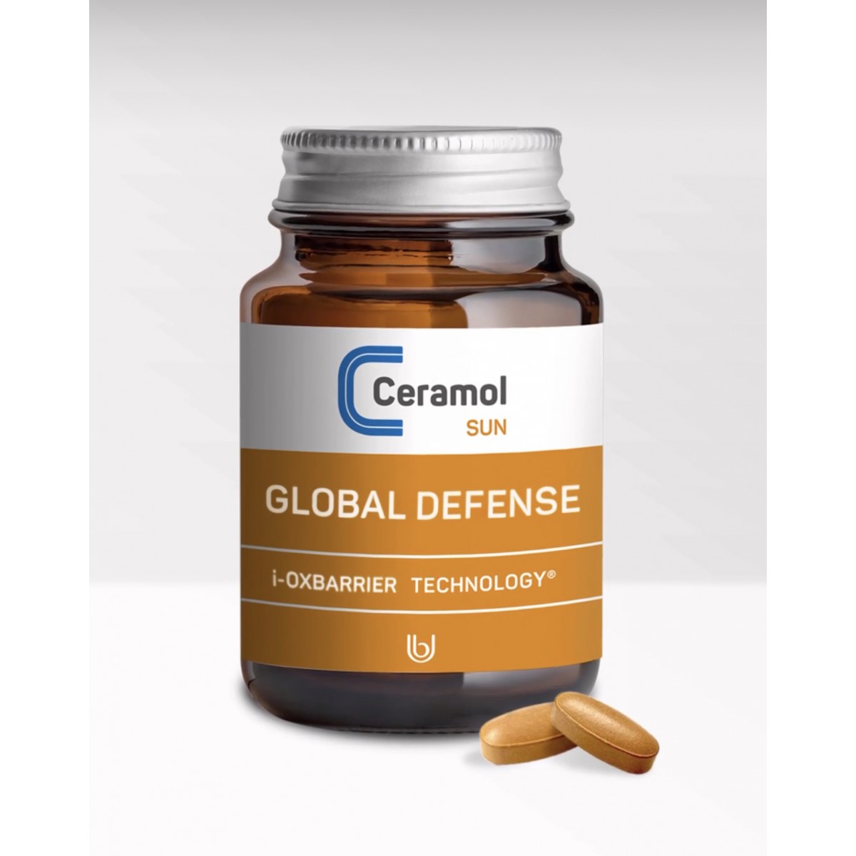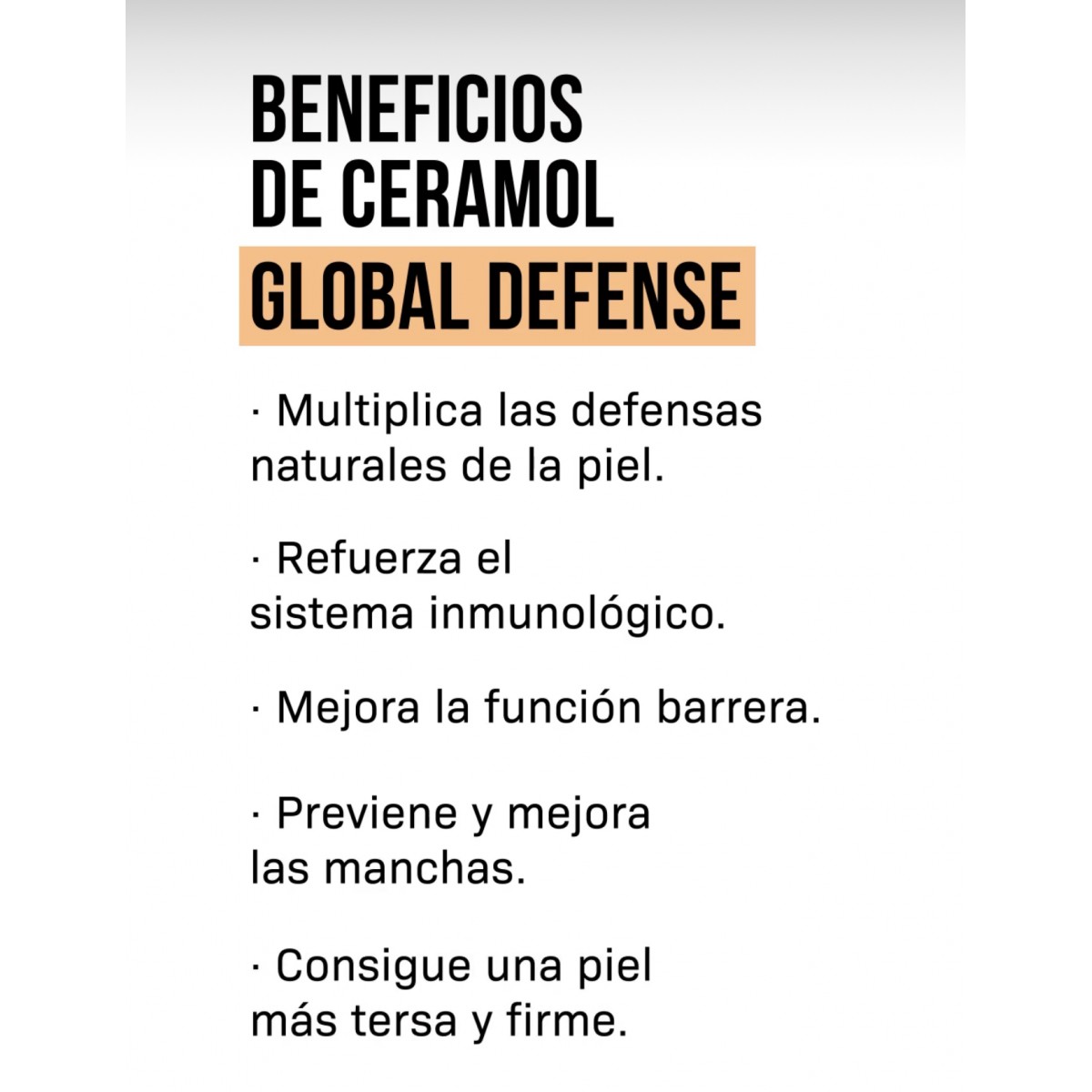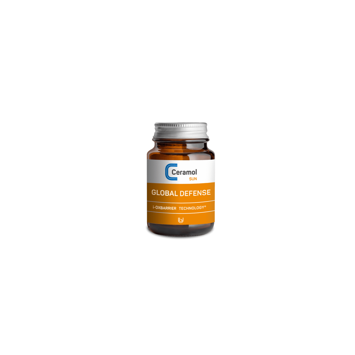 Global Defense de CERAMOL Sun: Con i-OxBarrier Technology, complejo Polupodium leucatomos y Alerce exclusivo y activos antioxidantes, como la Vitamina C, que refuerza las defensas naturales y protege frente al estrés celular oxidativo.
