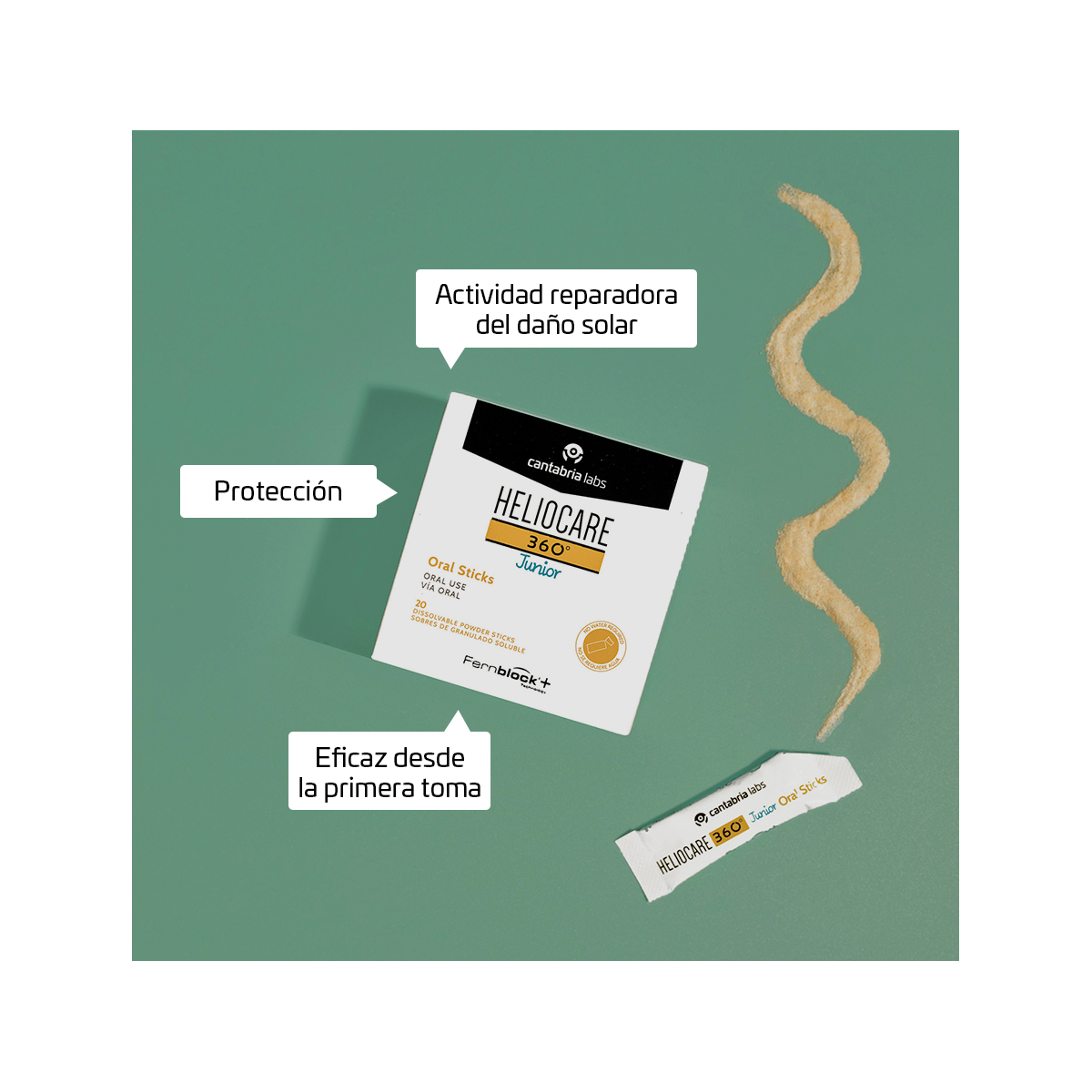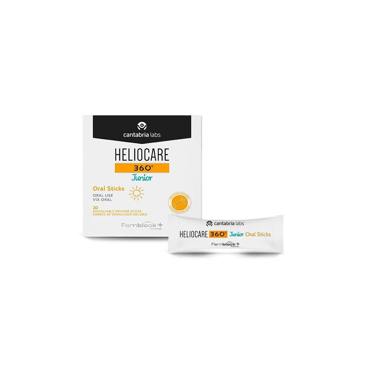 Heliocare 20 Sobres 360 Junior Oral Sticks Heliocare Heliocare 360o Junior Oral Sticks contiene Fernblock +, que ha demostrado una importante eficacia fotoinmunoprotectora, antioxidante y protectectora de las defensas de la piel. Indicado en niños a partir de 4 años. Beneficios: Su fórmula ayuda a aumentar la resistencia a la quemadura solar y se recomienda como complemento a la fotoprotección tópica. Su formato y su agradable sabor naranja facilitan la toma. Modo de aplicación: Vía oral. El contenido puede disolverse directamente en la boca, en agua o zumo de frutas. Tomar un sobre al día antes de la exposición solar en niños a partir de 4 años, y 2 sobres en niños mayores de 10 años.