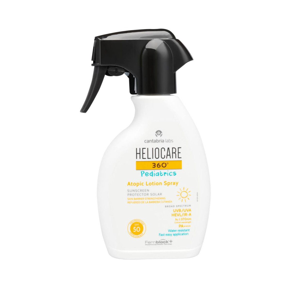 Heliocare 360o Pediatrics Atopic Lotion Spray SPF 50 250ml La loción solar Heliocare 360o Pediatrics es un fotoprotector indicado para las pieles atópicas de los pequeños de la casa. Propiedades de Heliocare 360o Pediatrics Atopic Lotion Spray Ofrece una protección solar alta (SPF 50) de amplio espectro frente a UVB, UVA e IRA. Además, su fórmula incluye Fernblock un potente antioxidante que protege y repara la piel. Está testada en piel atópica y su combinación de Arginina y Glicerina mejoran la función barrera de la piel, dejándola protegida y cuidada. Es resistente al agua, su formato en spray es de fácil absorción. Recomendado a partir de 3 meses. Cómo utilizar Heliocare 360o Pediatrics Atopic Lotion Spray Aplicar la loción Heliocare 360o sobre la piel atópica de los niños media hora antes de la exposición solar y repetir su aplicación siempre que sea necesario. Evitar aplicar directamente sobre la cara.