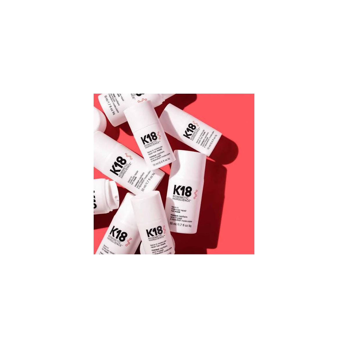 Se recomienda aplicar de 1 a 3 pulsaciones de la mascarilla K18 en el cabello húmedo, comenzando en las puntas y subiendo hacia las raíces. Dejar actuar durante 4 minutos.