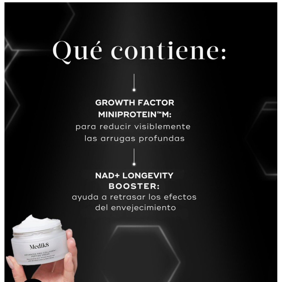 La potencia de Medik8 Advanced Pro-Collagen+ Peptide Cream reside en su combinación exclusiva de ingredientes biotecnológicos y péptidos avanzados. Su Miniproteína de factor de crecimiento™ estimula la producción de colágeno, elastina y ácido hialurónico, mientras que el Potenciador de longevidad NAD+ favorece la regeneración celular y mantiene la estructura de la piel. Además, la Carnosina, un potente péptido anti-AGE, combate los efectos de la glicación responsables del envejecimiento prematuro. Medik8 Advanced Pro-Collagen+ Peptide Cream también incorpora ácido poliglutámico, que potencia la hidratación duradera en sinergia con el ácido hialurónico, logrando un cutis más relleno y saludable.
