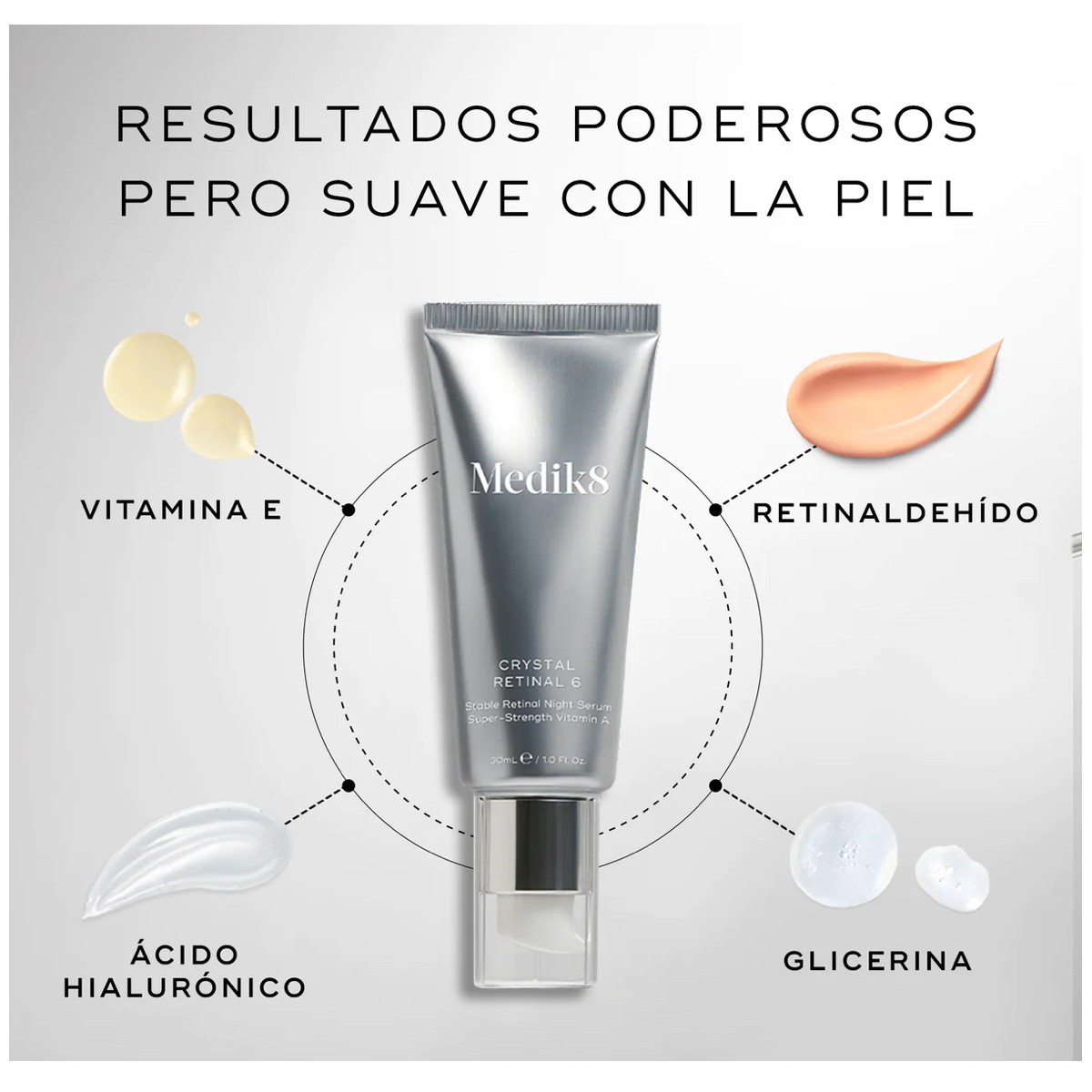 Descubre cómo lograr una piel joven con Crystal Retinal de Medik8, el suero innovador que reinventa el cuidado de la piel con vitamina A. Con retinaldehído, el retinoide de nueva generación que actúa 11 veces más rápido que el retinol, ahora disponible en una serie de 5 concentraciones progresivas para adaptarse a cada piel.