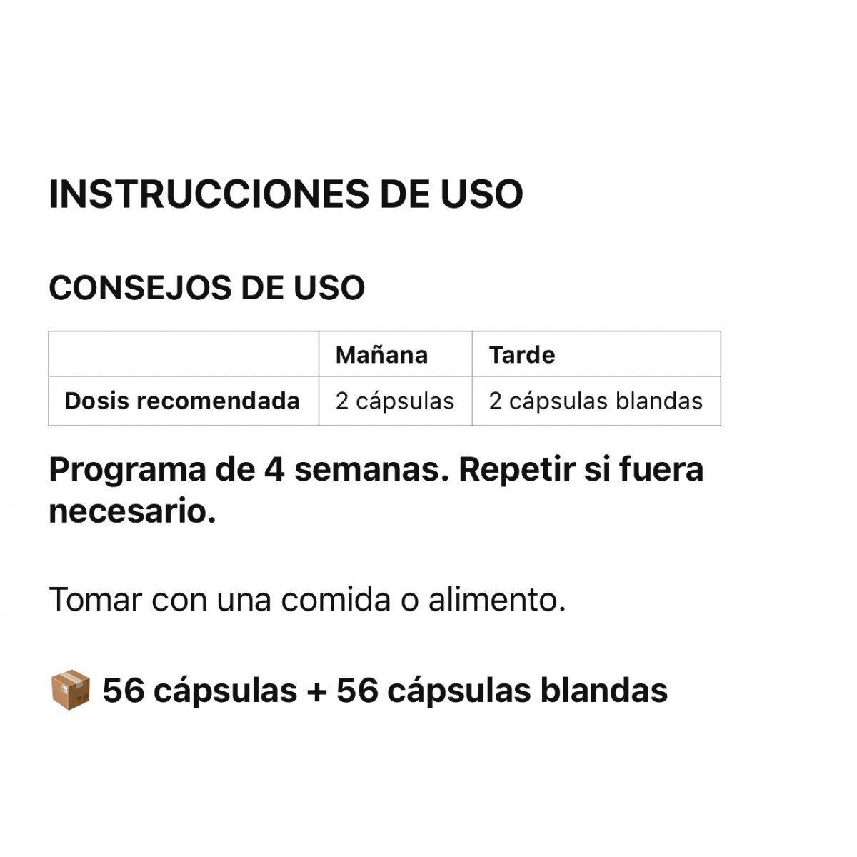 - 1 caja: 4 semanas. Renovable hasta 3 meses. Después de 3 meses, tómate un descanso de al menos 1 mes.