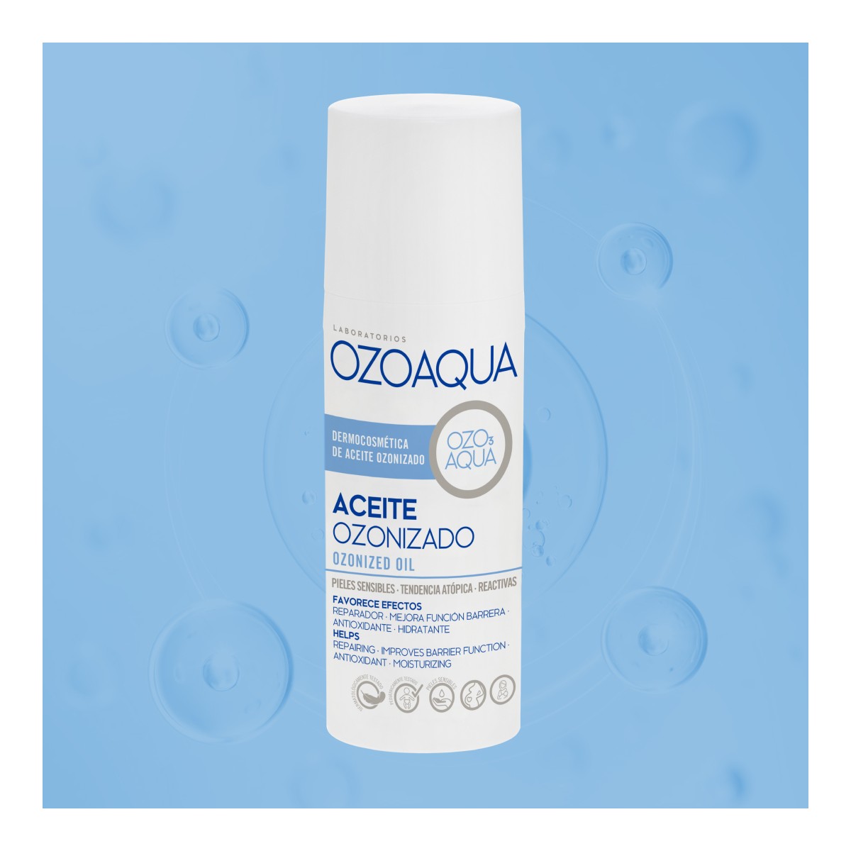 Los aceites ozonizados conservan numerosas propiedades beneficiosas del ozono: hidratante, antioxidante, germicida, regenerante, cicatrizante, calmante y reparador, entre otras. Su acción ayuda a recuperar el estado fisiológico natural de la piel.