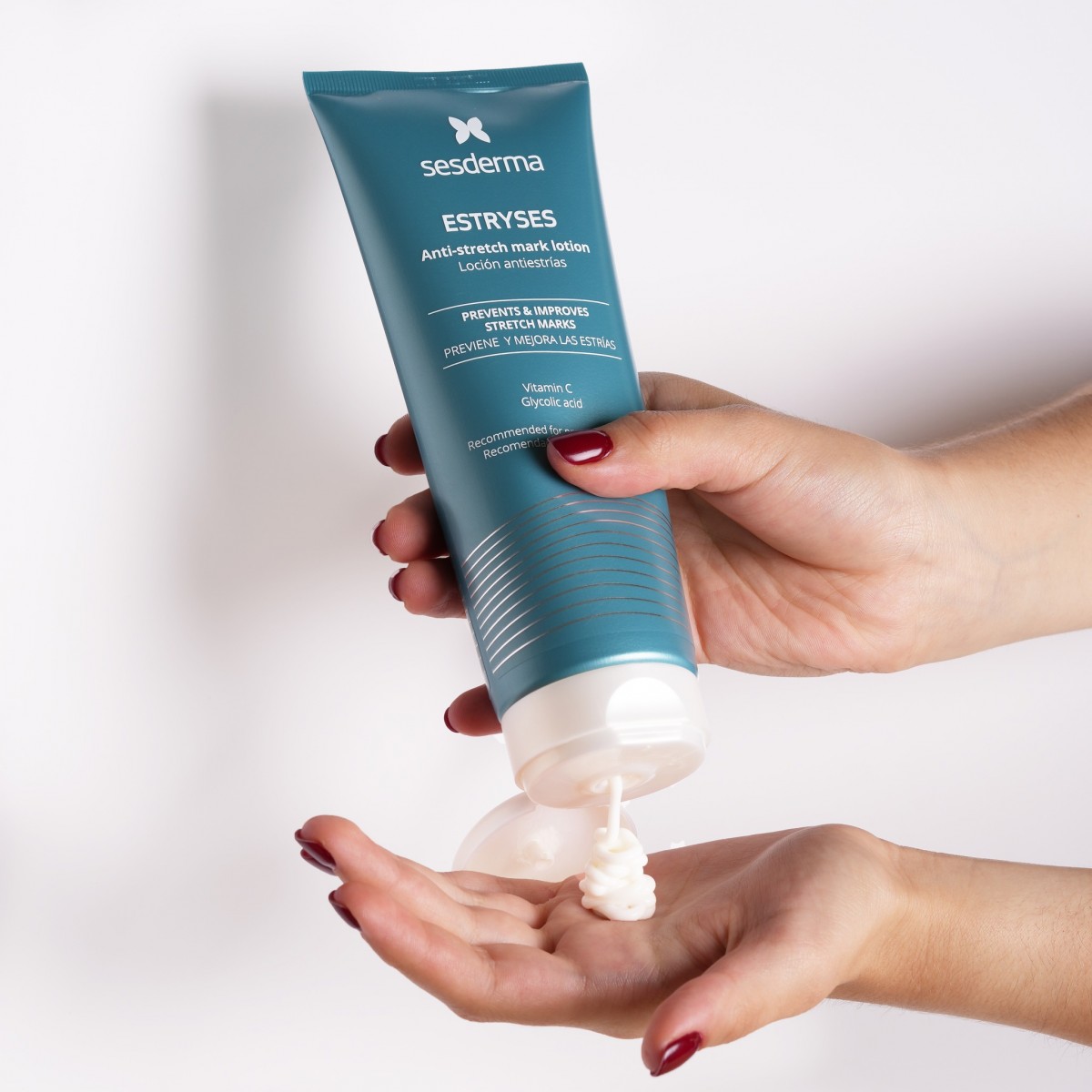 Sesderma Estryses Loción Antiestrías está formulado para la prevención y tratamiento de las estrías asociadas a cambios bruscos de peso (dietas, embarazo), hormonales (pubertad, embarazo), desarrollo muscular (deportistas). Incorpora activos con propiedades exfoliantes, reparadoras y regeneradoras, que reactivan el funcionamiento de la piel.