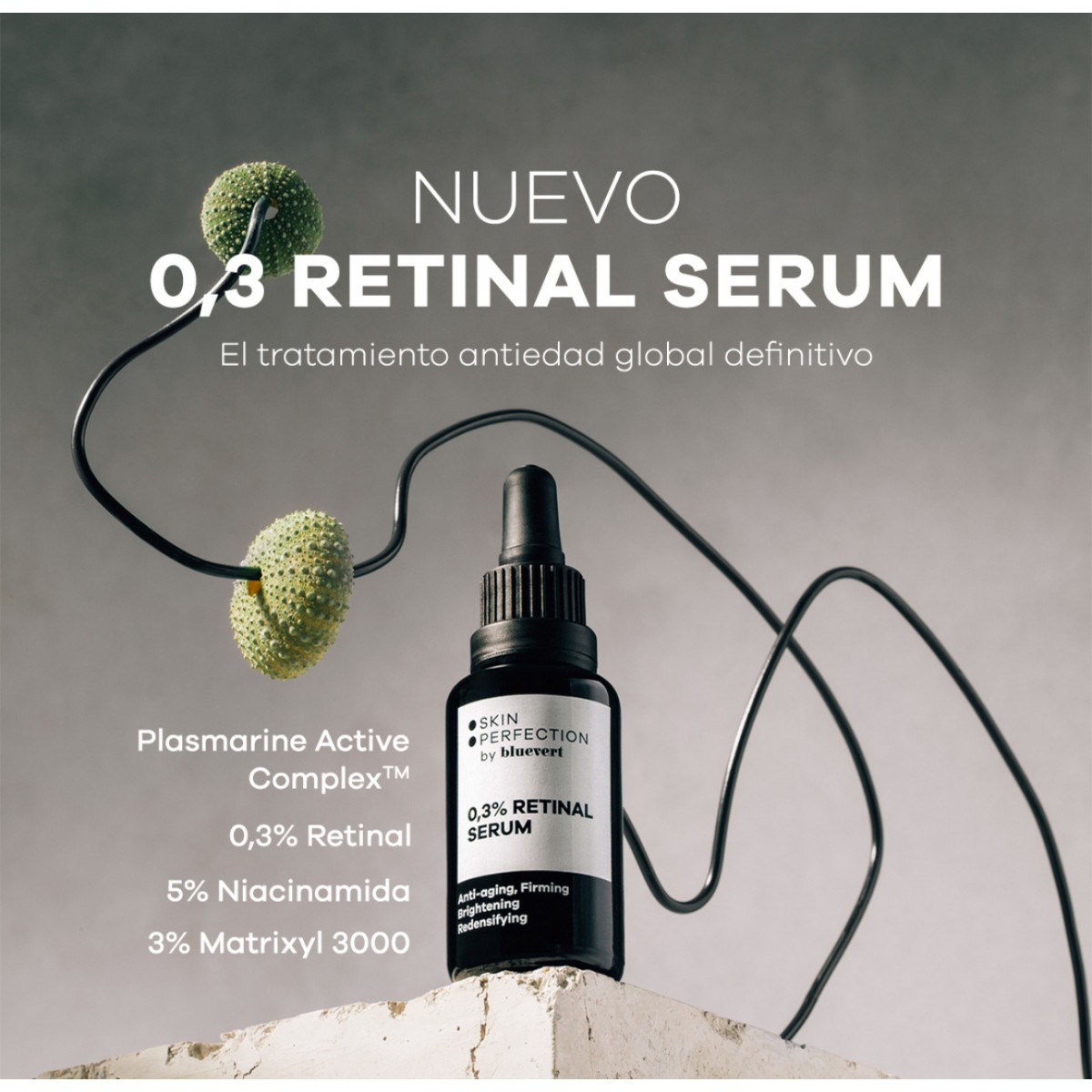 La innovadora fórmula de este sérum Bluevert 0.3 Retinal mejora la firmeza y la elasticidad de la piel. Previene y reduce las arrugas y las líneas de expresión.