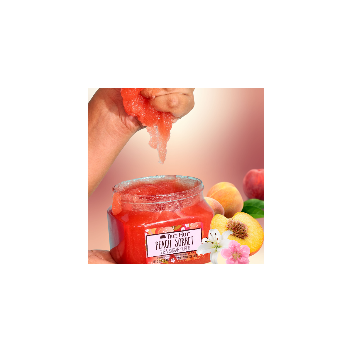 Revele una piel radiante con el Exfoliante Corporal Shea Sugar Scrub de Tree Hut con el dulce y jugoso aroma de Peach Sorbet.